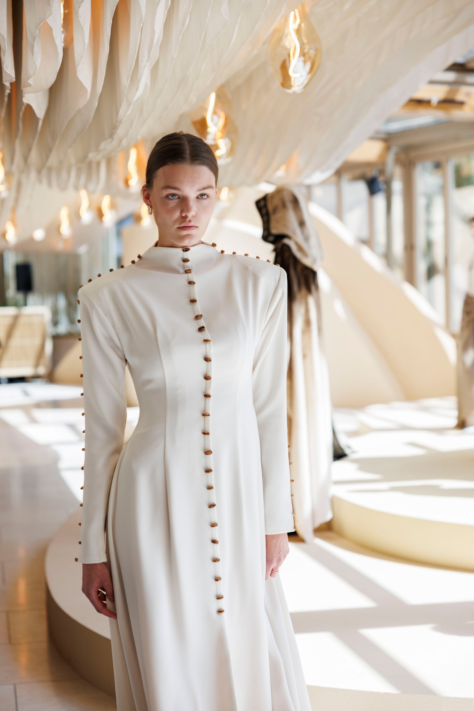 Crafted from luxurious off-white crepe, known for its smooth drape and structured form that flatters the silhouette with effortless grace.