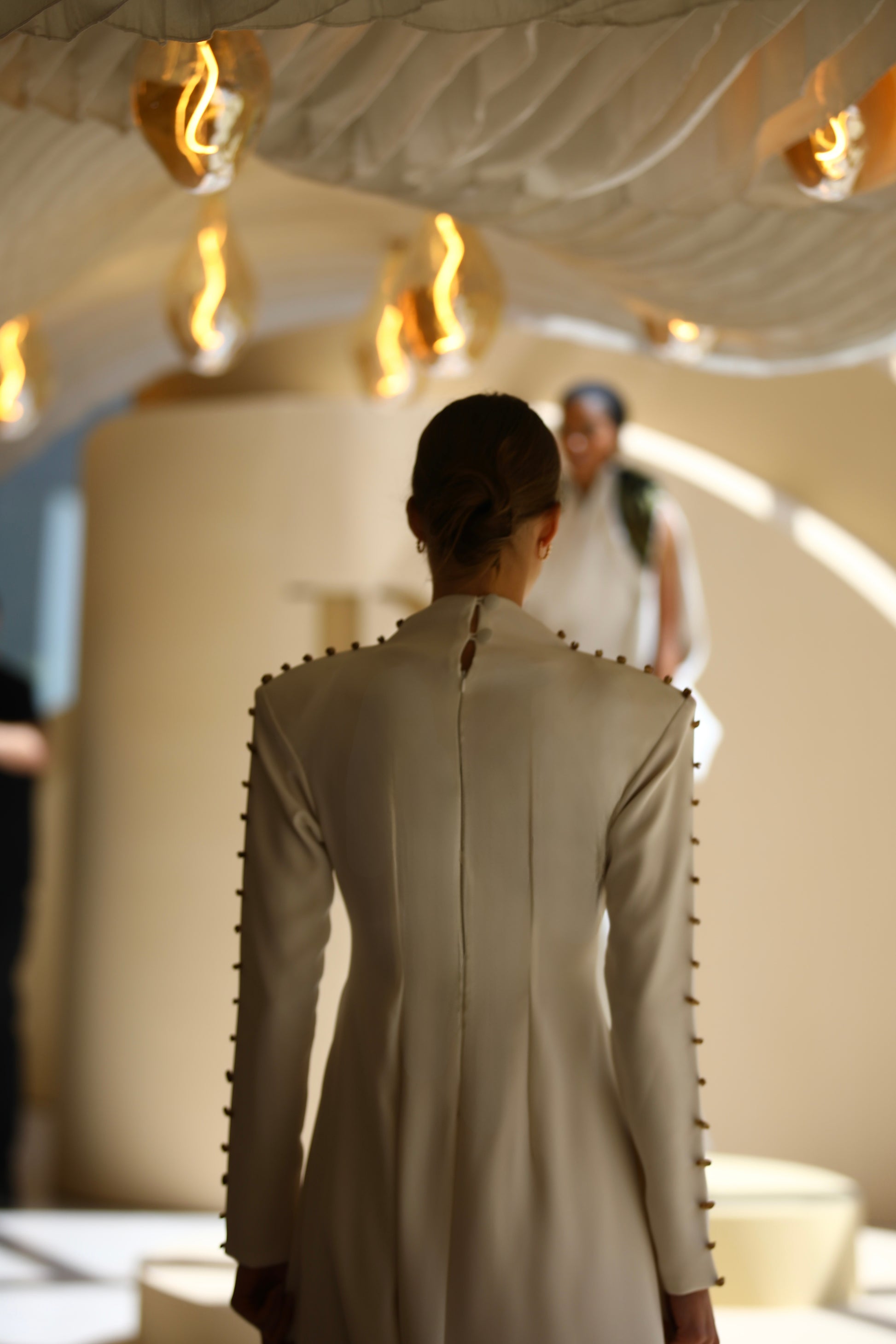 • Signature date-seed buttons: Handcrafted from real date seeds — a symbol of transformation and sustainability — tracing the front and sleeves in perfect symmetry.