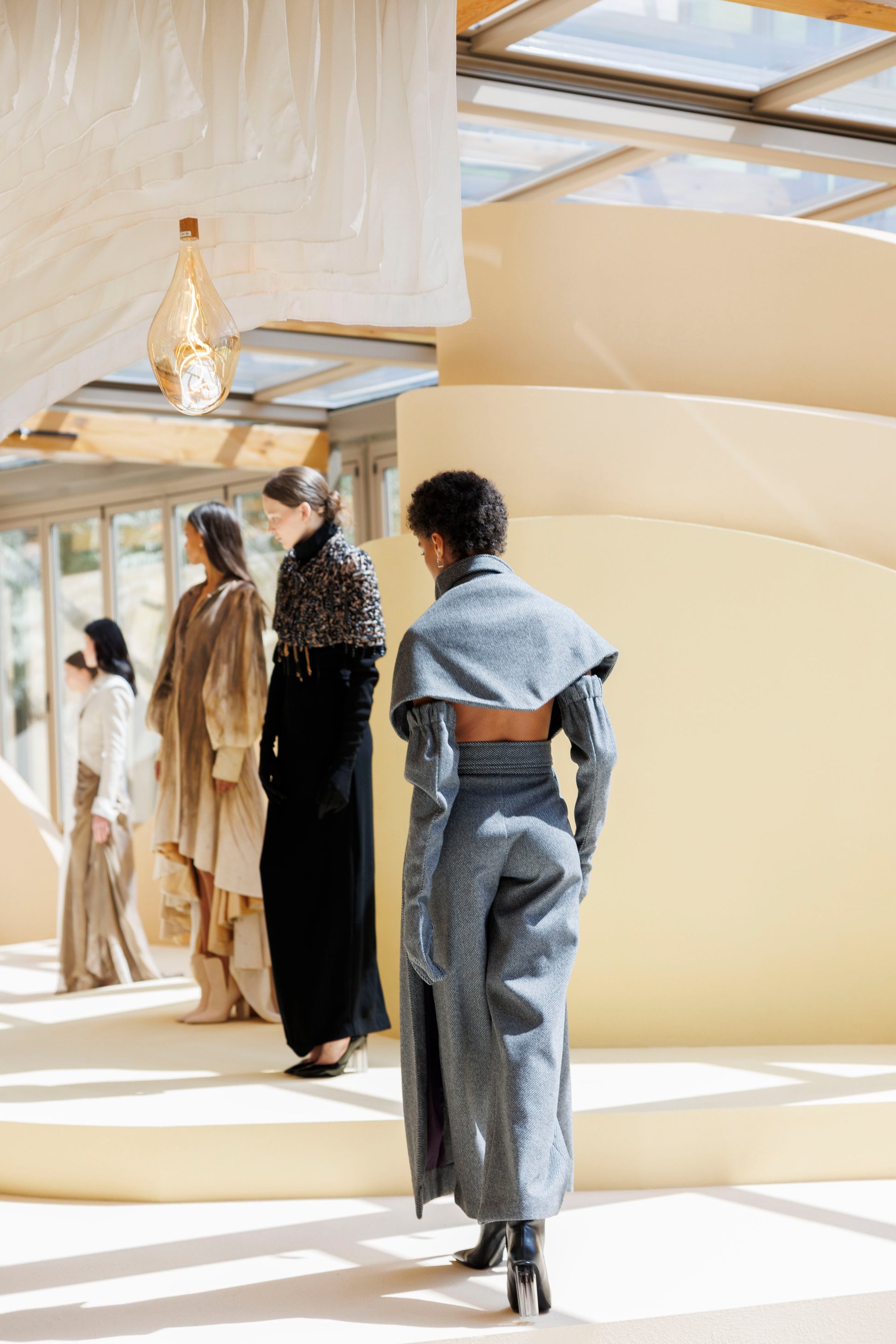 • Minimal fastening: A single sleek closure at the waist maintains architectural purity.