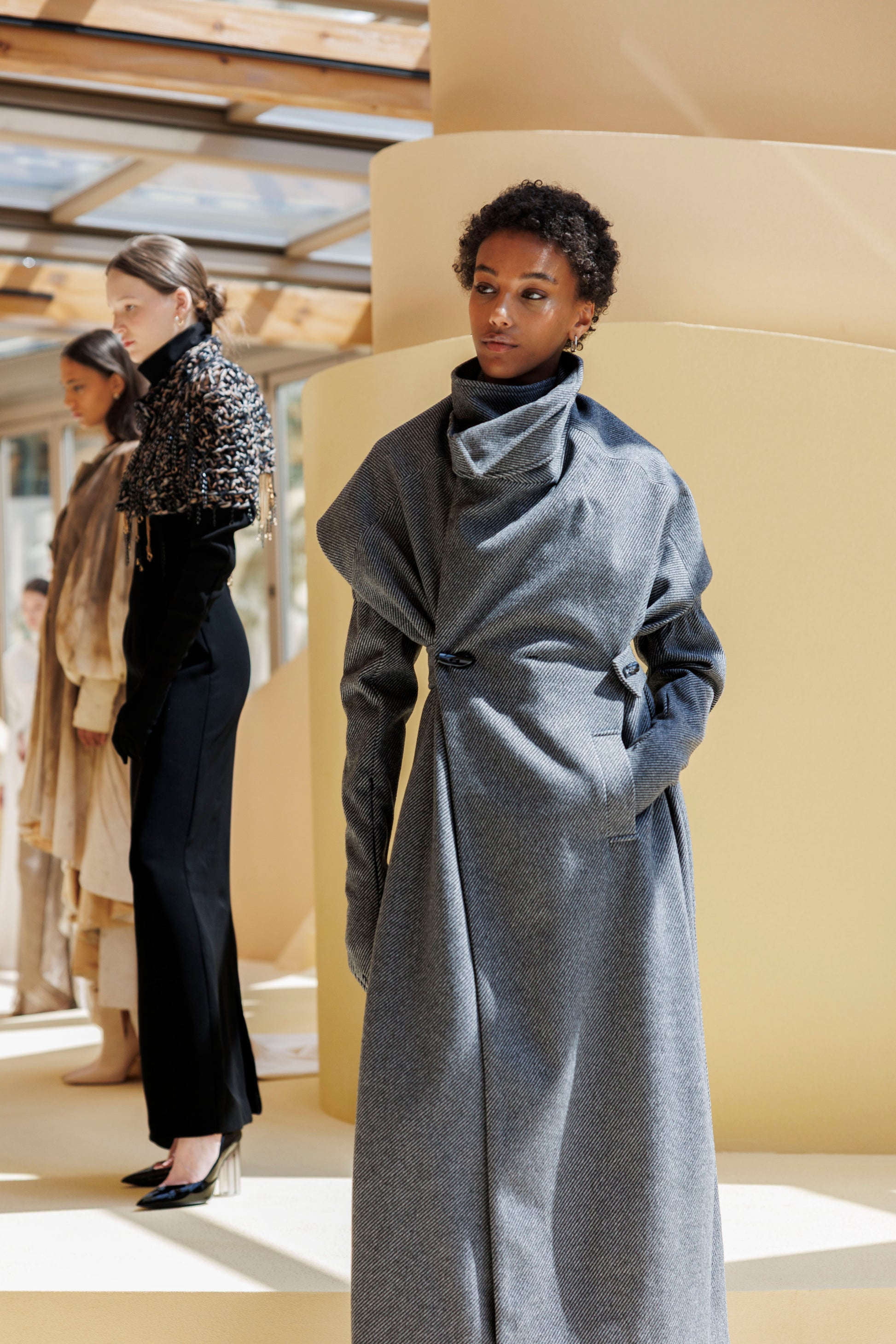 • Architectural silhouette: Strong shoulders and a high structured collar that frames the face with quiet authority.