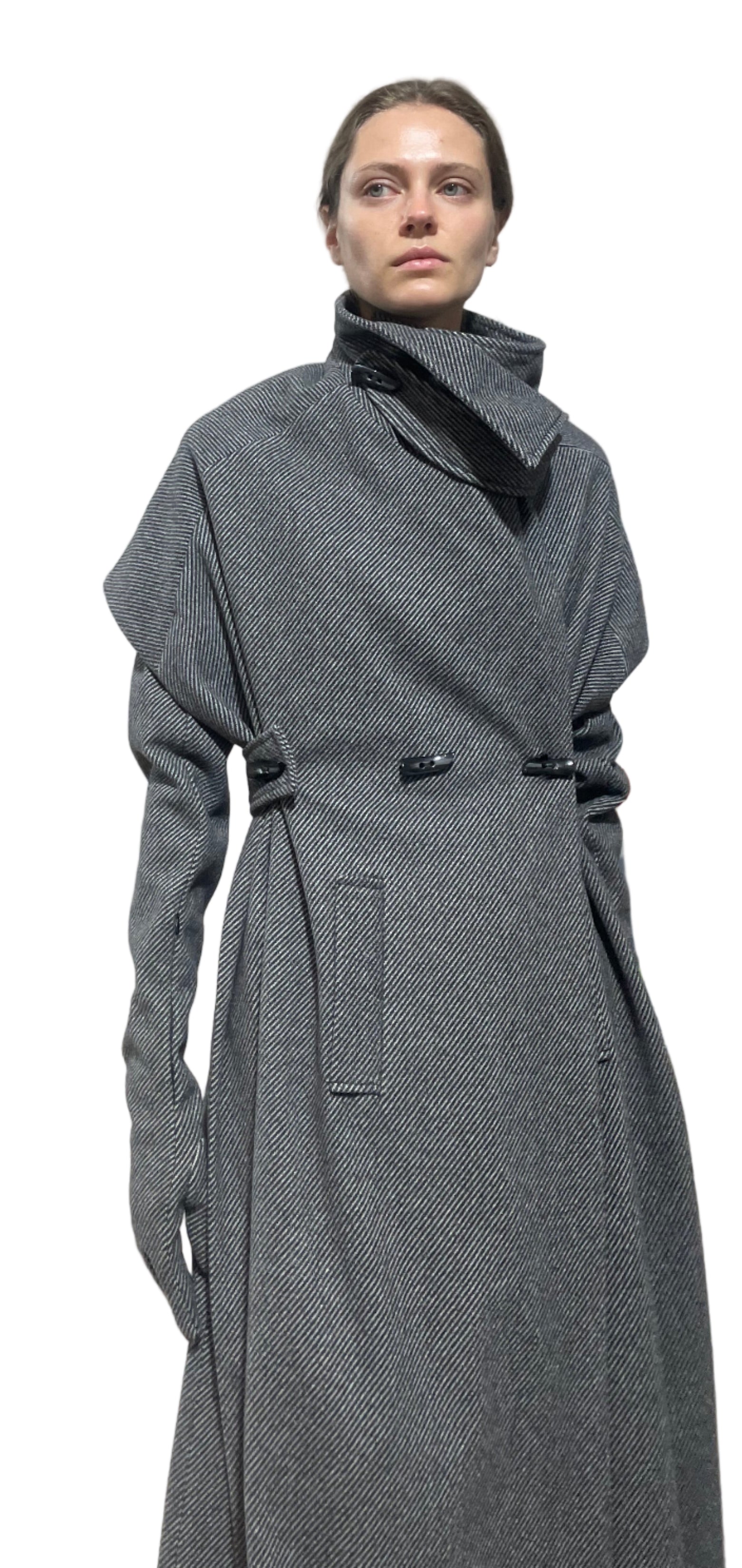 Tailored from premium charcoal wool with a subtle herringbone weave, chosen for its refined texture and sculptural drape.